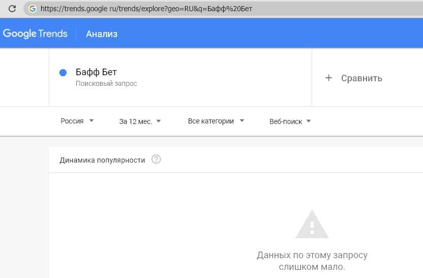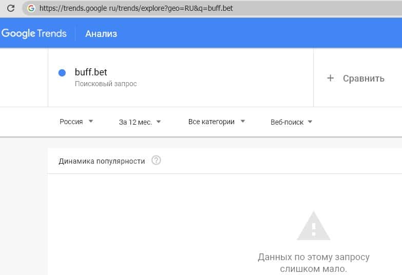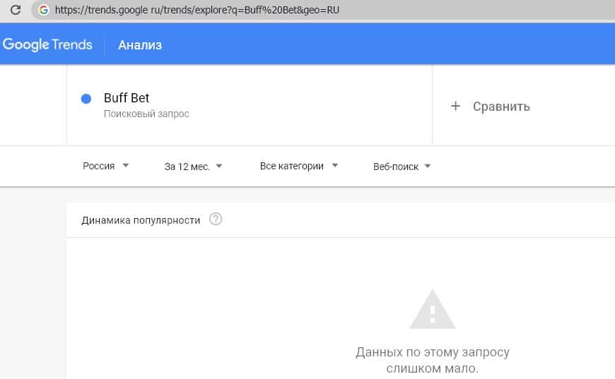 Поисковые запросы портала букмекерской конторы "buff bet" также не пользуются популярностью в поисковой системе Google.