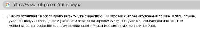 В п.11 аферисты из Bahigo оставляют за собой право в любой момент без объяснения причин, лишь по своему желанию закрыть любой клиентский счет. Твоя ставка выиграла, а счет тебе закрыли!