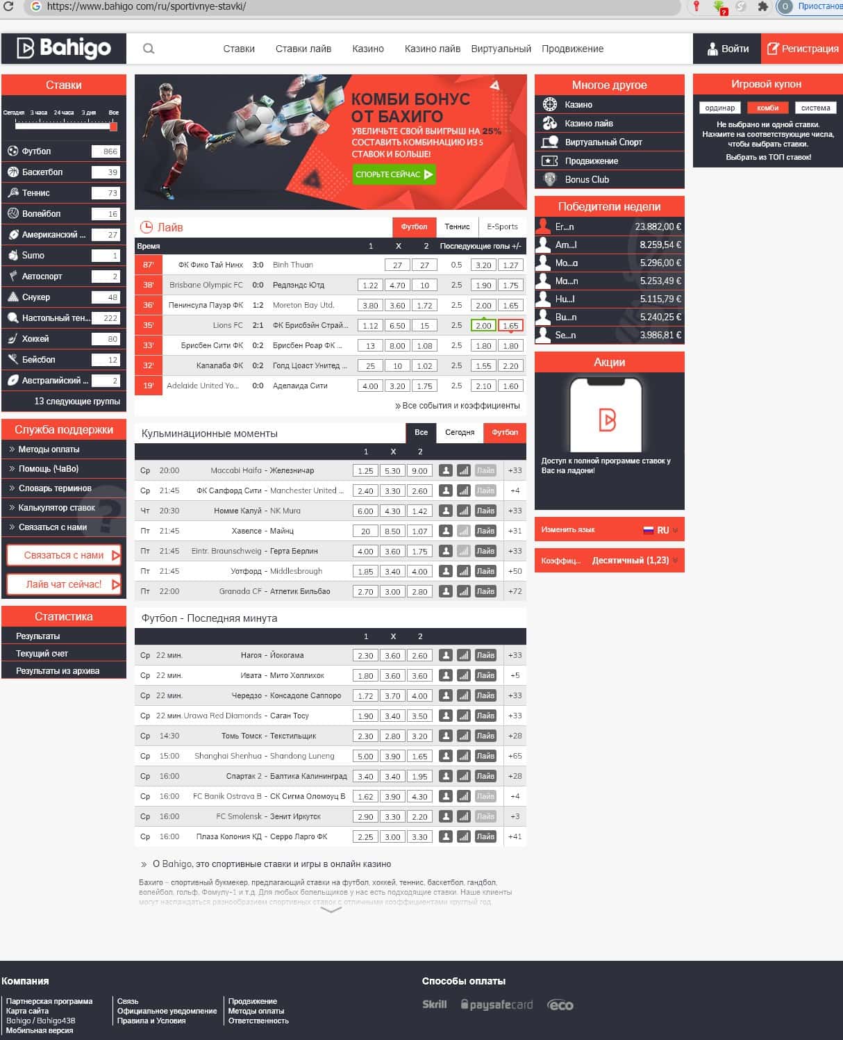 Главная страница букмекерской конторы Bahigo выглядит ярко: немного рекламы проекта и много информационных таблиц о ставках, о видах спорта, клубах, играх, доступных для ставок и т.д. - у азартных болельщиков "разбегаются глаза"!