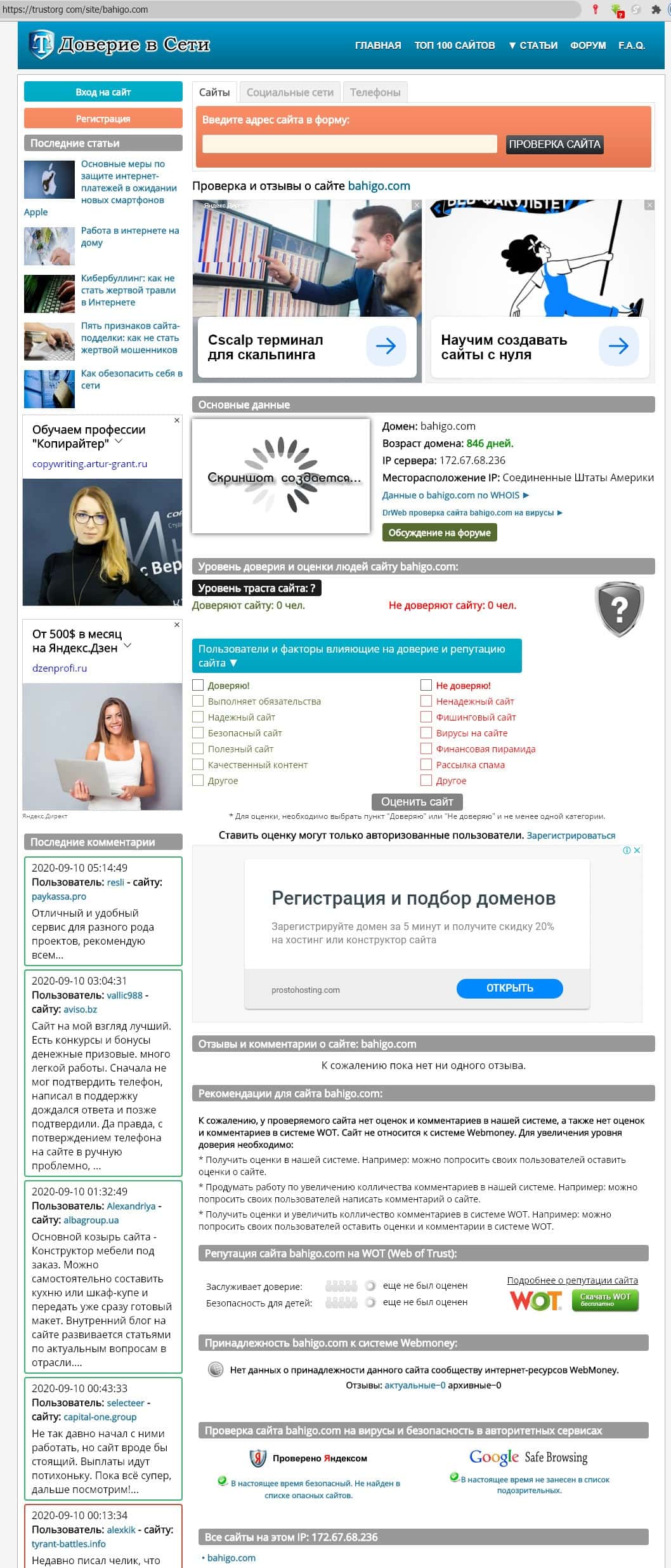 - Неопределенная оценка сайта Бахиго на портале trustorg com при возрасте в 846 дней