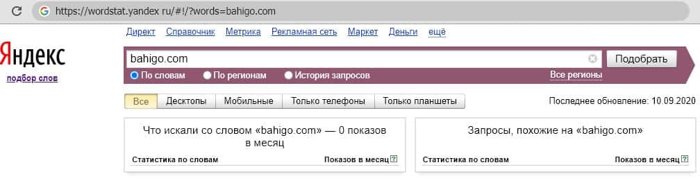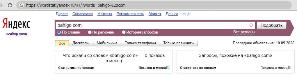 Запросов "bahigo.com" то же не поступало на поисковую систему Яндекса в течение месяца.