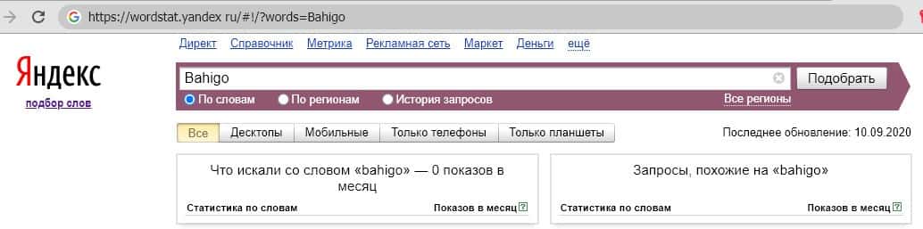 Ответ поисковой системы Яндекс по количеству запрошенных за месяц запросов "Bahigo" составил ни много, ни мало, а целый ноль.