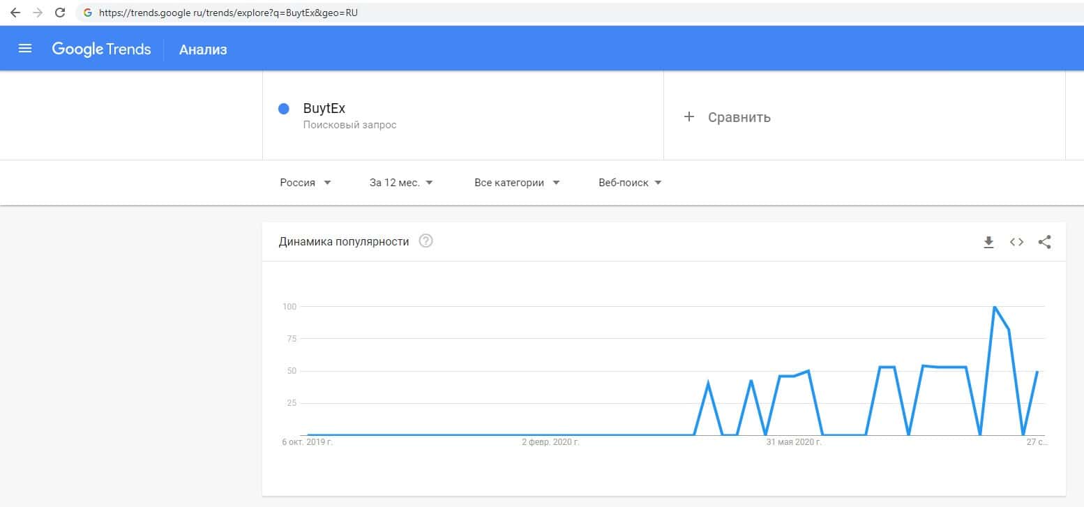 По количеству брендовых запросов сокращенного названия компании на английском языке "BuytEx" на trends google ru отслеживается некая динамика популярности.