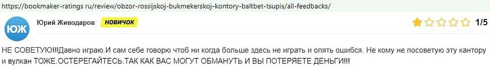 А вот еще один коротенький отзыв об интернет-надувательстве Балт Бет, в котором юзер данного недоресурса не рекомендует использовать этот сервис для получения денег и прибыли.