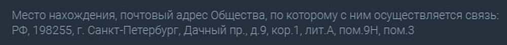 РФ, 198255, г. Санкт-Петербург, Дачный пр., д.9, кор.1, лит.А, пом.9Н, пом.3