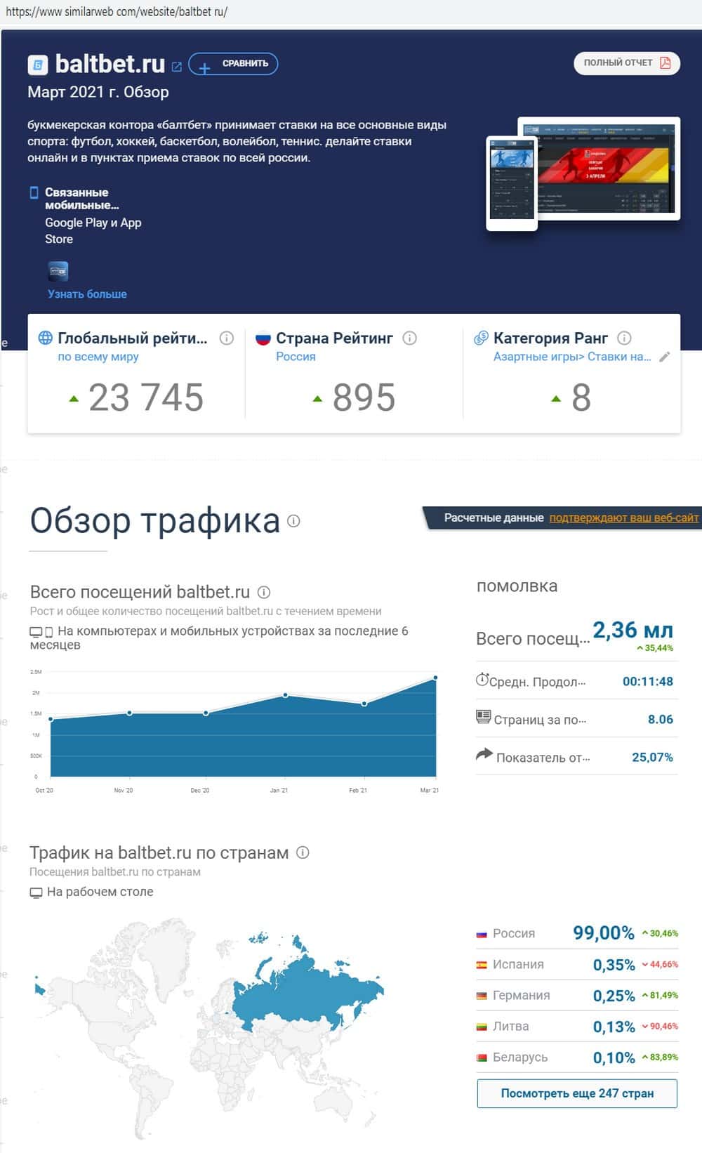 Как показывает веб-ресурс симиларвеб ком, кидалы BaltBet Ru получают свой трафик в основном из России, частично к ним на сайт заходят доверчивые игроки из Испании и Германии.