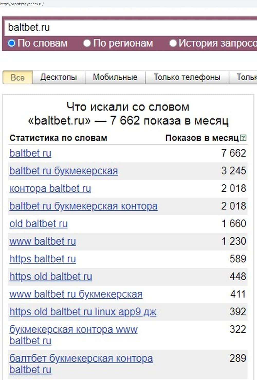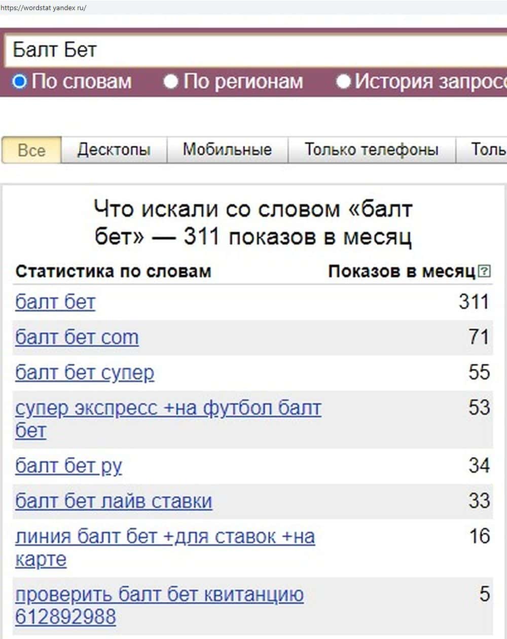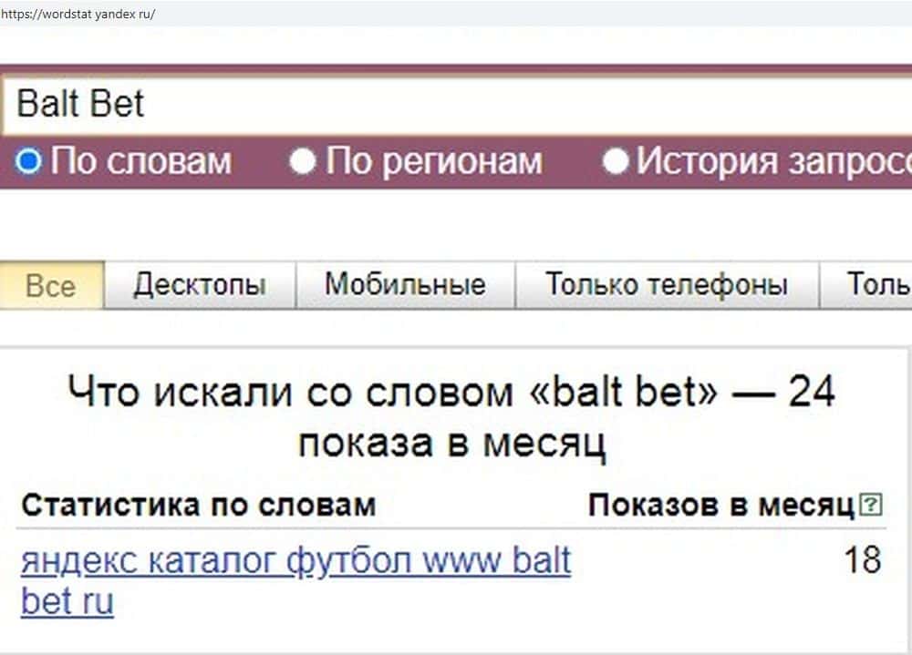 По запросу "Балт Бет" показов меньше, всего 311. Так что контора мошенников не так уж и популярна. Тем более, что в сети появилось уже достаточно много правдивых отзывов от жертв.