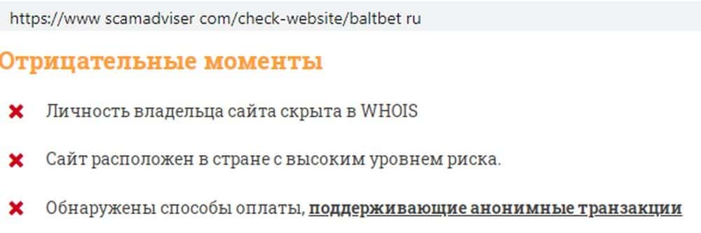 Популярный веб-ресурс скамэдвайзер ком предупреждает, что с шарлатанами Балт Бет лучше не связываться: они скрывают личные данные, используют анонимные способы оплаты.