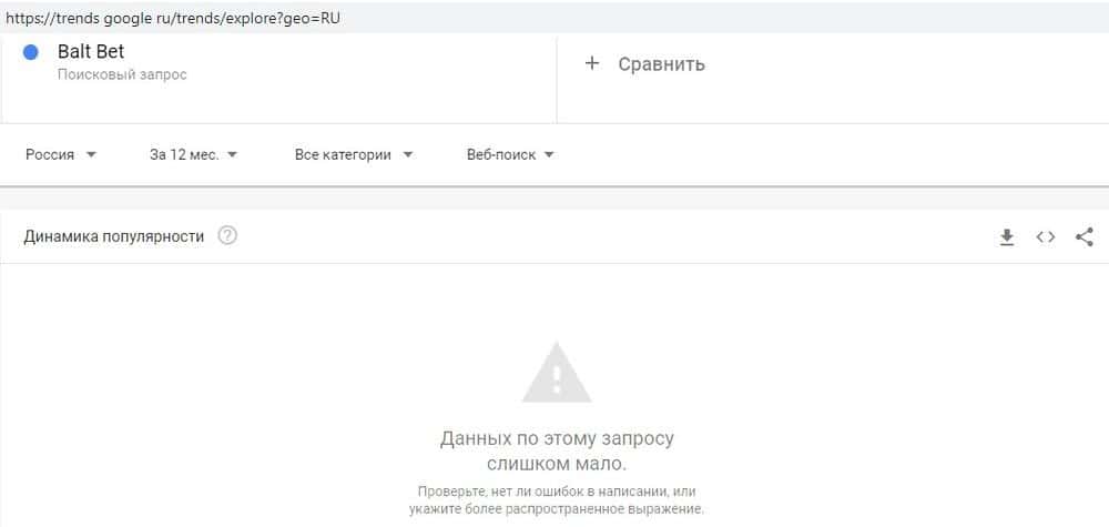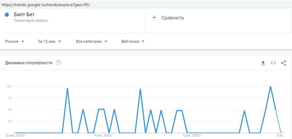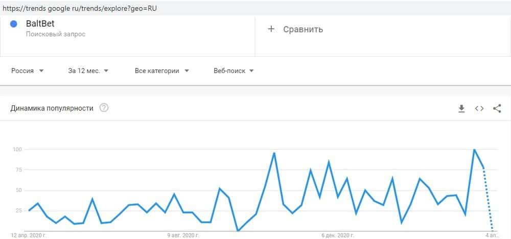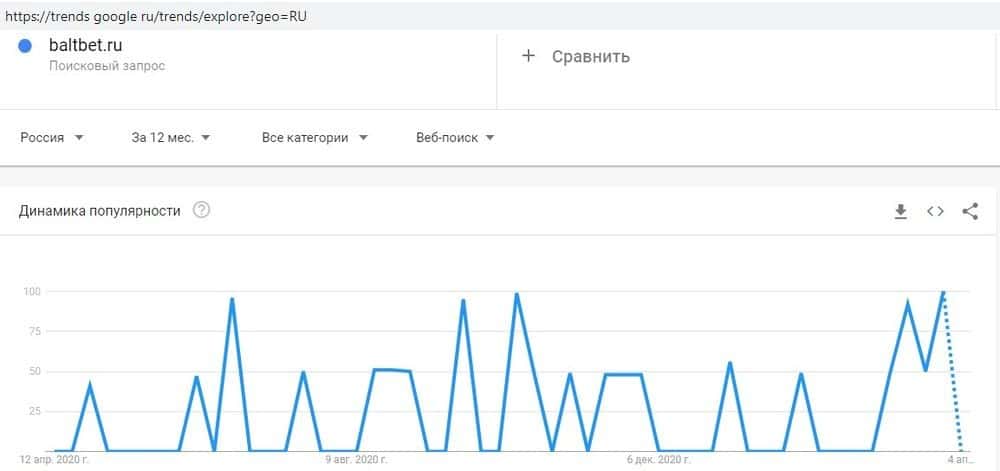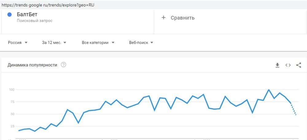 Среди пользователей Гугл популярность скам-проекта затухает - это видно по запросу "baltbet.ru" - в последнее время все меньше доверчивых игроков пытаются найти эту шарагу.