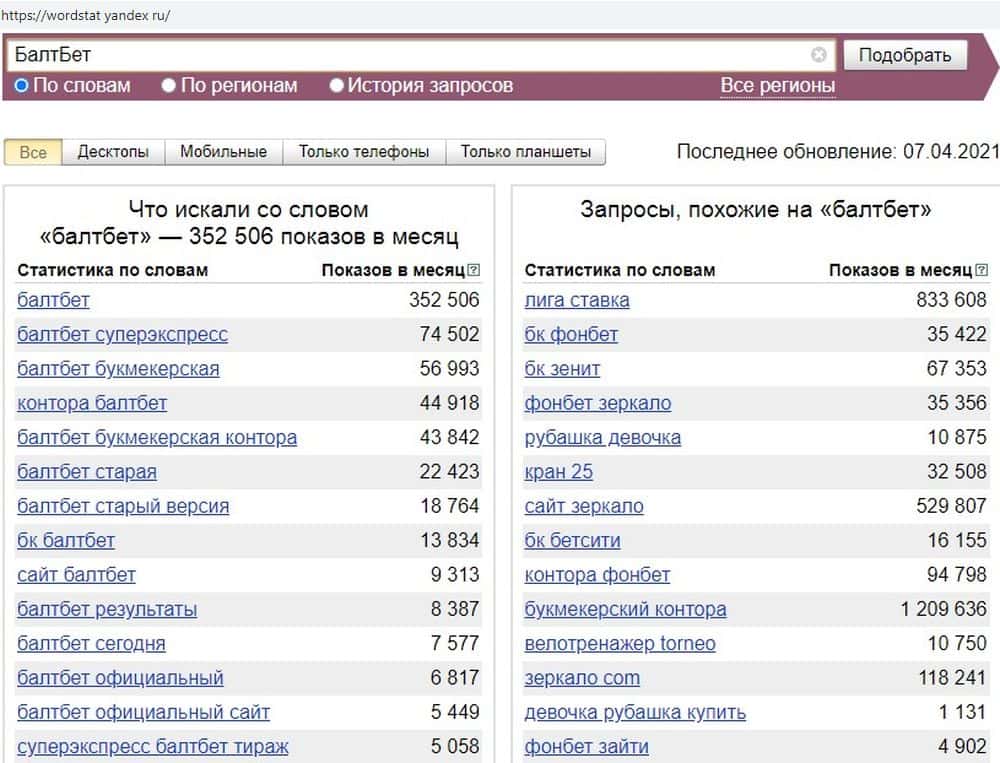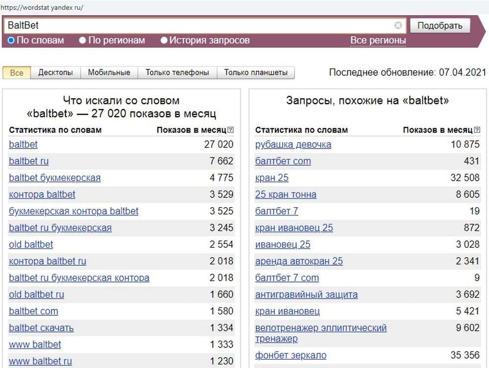 По запросу "БалтБет" около 35000 показов. И тут видно, что люди ищут некую БК, которая раньше имела похожее название, и была популярна. Но ее нет, а жулики косят под этот проект.
