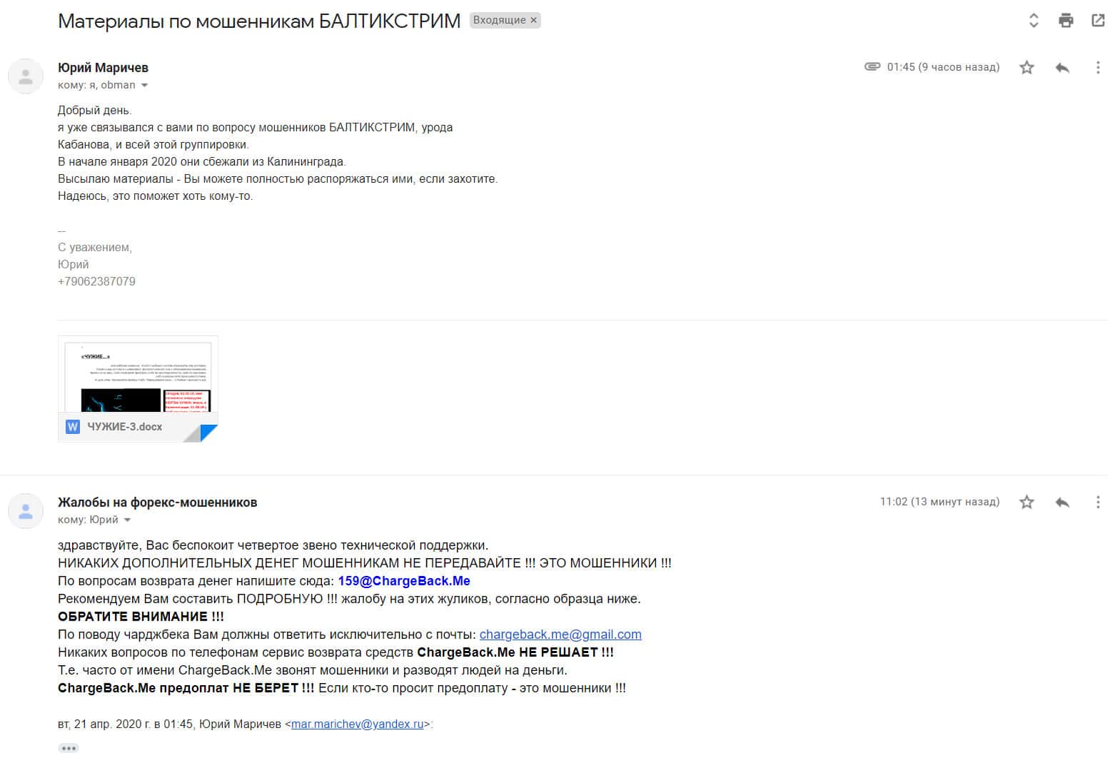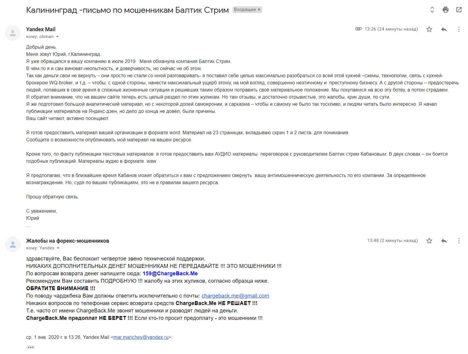 Далее представлено письмо, в котором автор жалобы прикрепил развернутые сведения касательно деятельности аферистов Балтик Стрим.