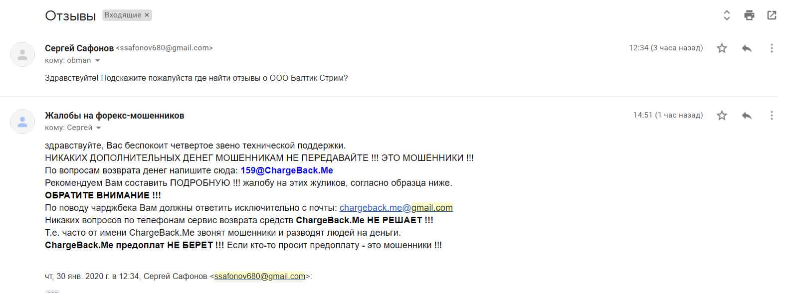 Очередное письмо, касающееся компании Балтик Стрим, пришло на почтовый ящик интернет-сервиса по сбору жалоба на разных брокеров-мошенников. Автор материала интересуется сей организацией, основная цель которой, привлечь как можно больше доверчивых граждан и посодействовать тому, чтобы те открыли счет у такой жульнической организации из оффшора.