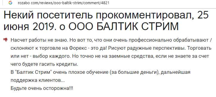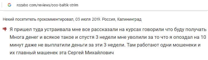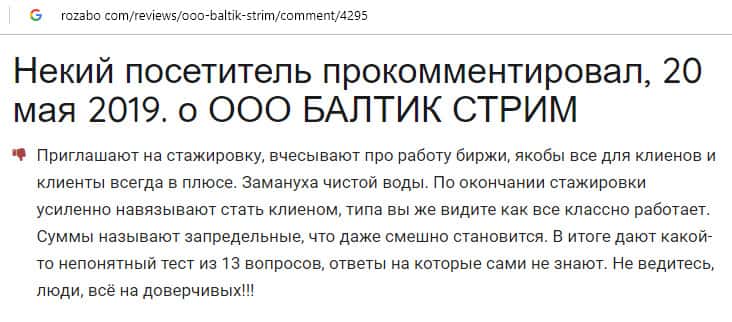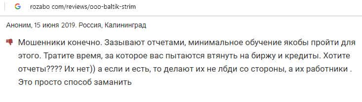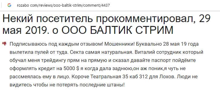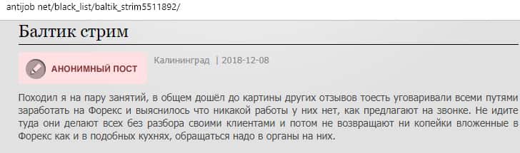 В данном отзыве человек ясно рассказывает, как он приходил на 2 занятия от брокерской конторы Балтик Стрим где менеджеры постоянно уговаривали его заработать на рынке Форекс. Для этого нужно было вложить денег. Но судя по отзывам, шарлатаны не вернули своим вкладчикам ни копейки.
