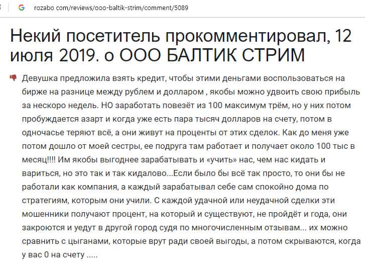 В этом отзыве человек рассказывает, как ему девушка, работающая в конторе Балтик Стрим стала навязывать мнение, что нужно взять кредит и вложить в их контору. Правда гарантий она никаких не дает, но все же они постараются, чтобы все деньги не были слиты. Таким образом многие люди попадают в долговую яму.