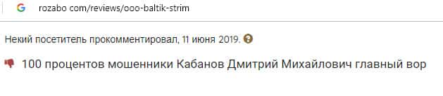 Следующая информация рассказана еще одним анонимным пользователем сети, в которой рассказывается, что мошенники Baltik Stream являются 100-процентными разводилами. При чем он также указал имя и фамилию обидчика, а именно Кабанов Дмитрий Михайлович, который является главным вором.