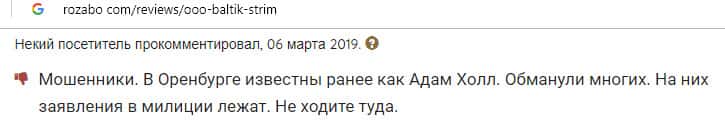 В еще одном отзыве нам удалось найти интересную информацию, касательно работы лохотрона Балтик Стрим. Шарлатаны работают также в городе Оренбург под другим названием, а именно Адам Холл. Эти шулера обманули уже многих, поэтому люди просто пошли в местный райотдел и написали на жулье заявление.