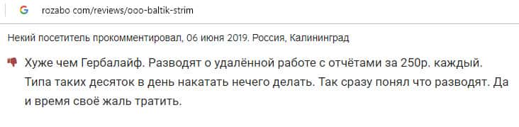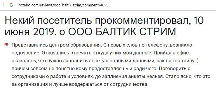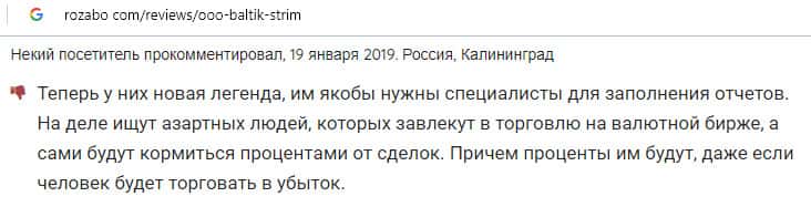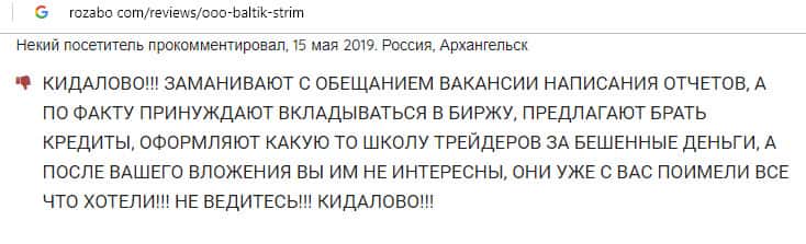 Дилинговая контора Балтик Стрим в очередной раз доказала, что умеет заманивать в свою аферу новых жертв и этому подтверждение следующий отзыв. Аферисты обещают вакансией на написание отчетов, а на самом деле, когда вы придете в офис, то там вынуждают вложить в биржу Форекс, где эти деньги собственно и останутся.