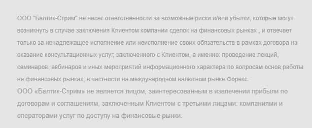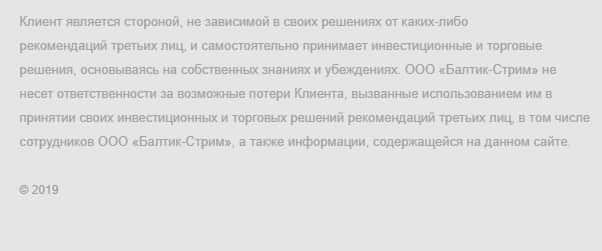 О регулировании своей деятельности, контора Балтик Стрим также не указывает никаких данных, так как лицензии или прочих документов она не имеет. Единственное что указано, так это то, что лохотрон Baltik Stream не несет ответственности за убытки клиента, которые могут возникнуть в случае работы с ними.