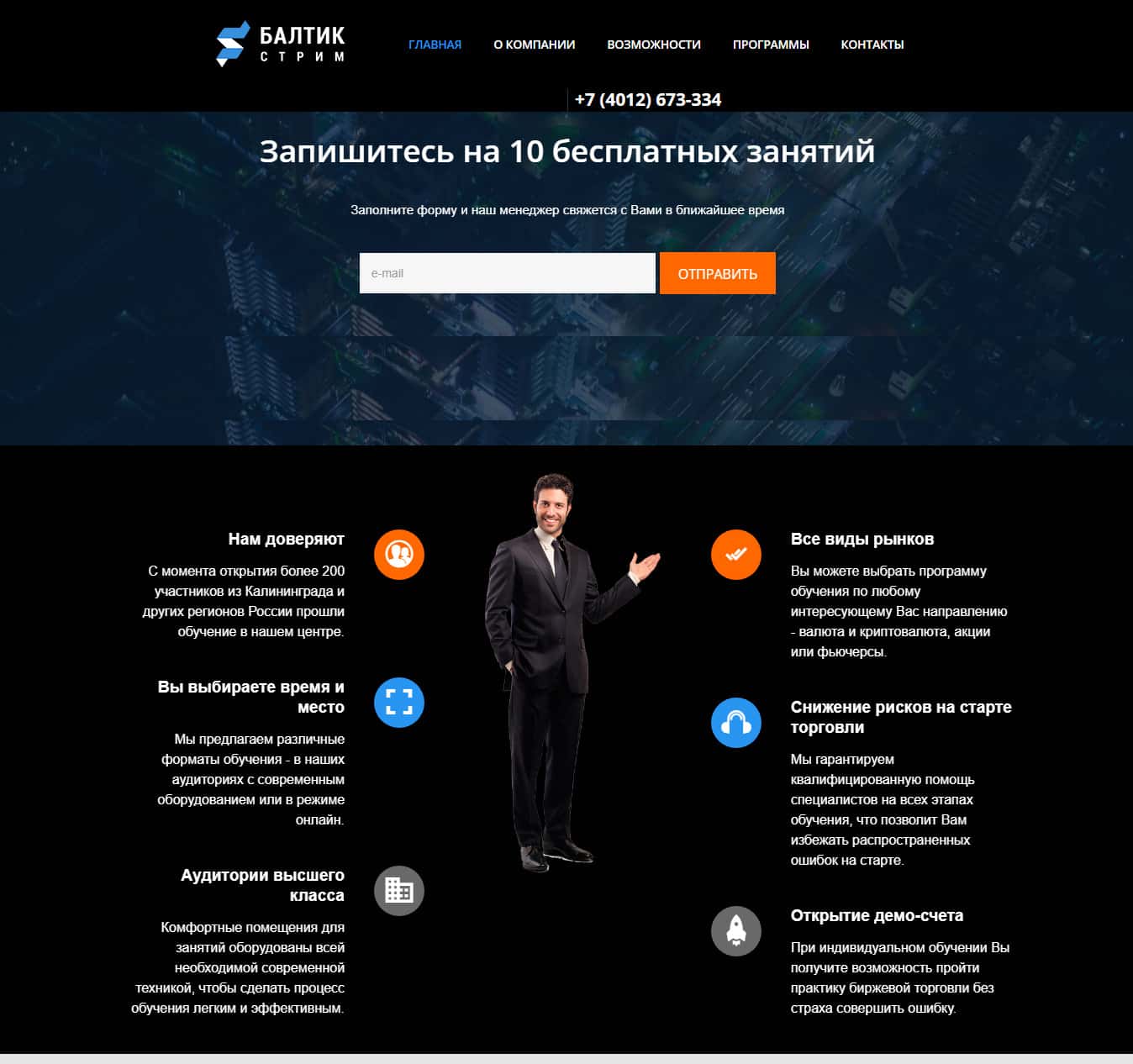 Если рассмотреть интернет-ресурс конторы Baltik Stream, то сразу бросается в глаза куча ненужной информации, на которую могут клюнуть новички. По существу ничего об условиях торговли не рассказано, поэтому это просто голые высказывания. Также сайт-одностраничник навевает мысль, что шарага Балтик Стрим рассчитана не не долгое существование.