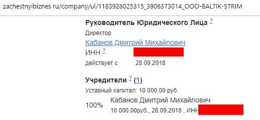 Чтобы узнать руководство и учредителей конторы Baltik Stream, нам пришлось покопаться в реестре компаний Российской Федерации. Жулики зарегистрированы как ООО "Балтик Стрим", а также имеют разрешение на консультирование по вопросам коммерческой деятельности и управления. Далее представлено лицо, которое якобы причастно к работе шараги: