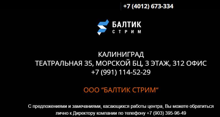 Ниже вы можете увидеть подробную статью о деятельности конторы Балтик Стрим. Один клиент, который попался на удочку в эту аферу, решил собрать воедино все данные и создал данный материал воедино. Их организация зарегистрирована как ООО "Балтик Стрим" и находится по адресу: Калининград, ул. Театральная, 35. БЦ "Морской", 3 этаж, кабинет 312.