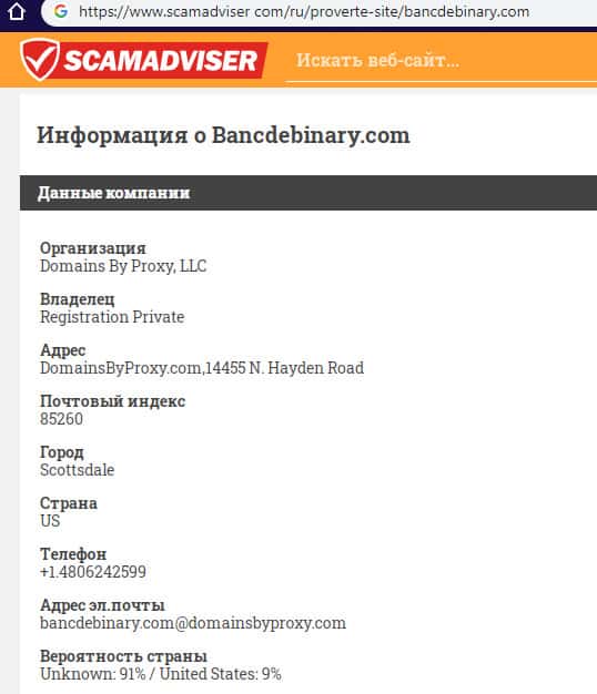 Техническую информацию о деятельности подвального сайта мошенников Банк Де Бинари, а именно возраст, страну регистрации и местоположение сервера сайта аферистов Banc De Binary, можно узнать непосредственно с помощью портала scamadviser com. На изображении, расположенном ниже, вы можете наглядно увидеть информацию о сайте шулеров Банк де Бинари.