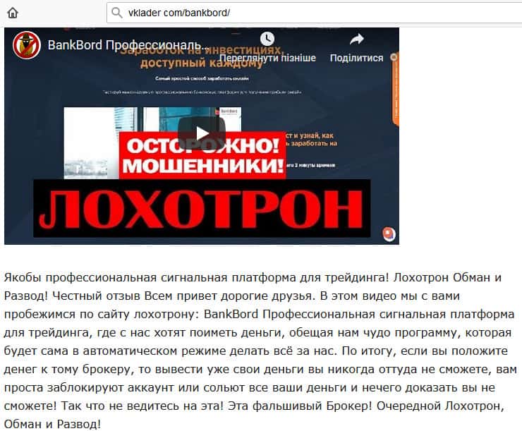 Как бы мошенники не маскировали свою деятельность, но все больше сайтов указывают на то, что BankBord не более чем лохотрон и обман, которому ни в коем случае нельзя доверять свои деньги. Причем тут верно подмечено, что они при этом еще и предлагают "чудо-программу", которая будет все делать за пользователя и он спокойно заработает денег.
