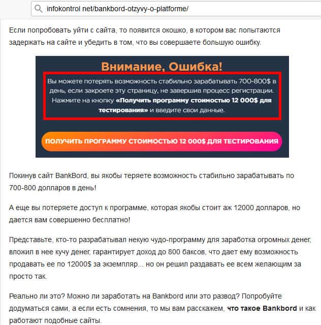 Одна из заманух, которыми Банк Борд пытаются удержать своих жертв у себя на сайте - это сообщение о том, что вы совершаете большую ошибку и если мол сейчас уйдете, то потеряете возможность зарабатывать по 700-800$ в день. Это не новая замануха, но, тем не менее, она все-таки работает на определенную категорию доверчивого населения.