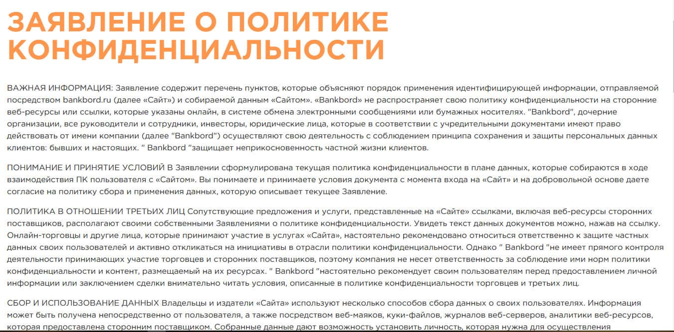 - Политика конфиденциальности BankBord не защищает клиента