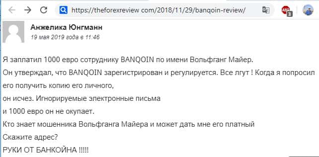 Возмущенный трейдер поделился на информационном сайте theforexreview com своей историей о том, как его обманули мошенники из брокерской компании Banqoin, которым он заплатил 1000 евро, а при попытке вывести эти денежные средства, работники брокера пропали и перестали выходить на связь.