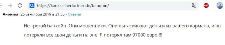 На странице информационного интернет-портала kanzlei-herfurtner de размещен отзыв обманутого доверчивого трейдера, который, после общения с аферистами из брокерской компании Банкойн стал беднее на 97 тысяч евро.