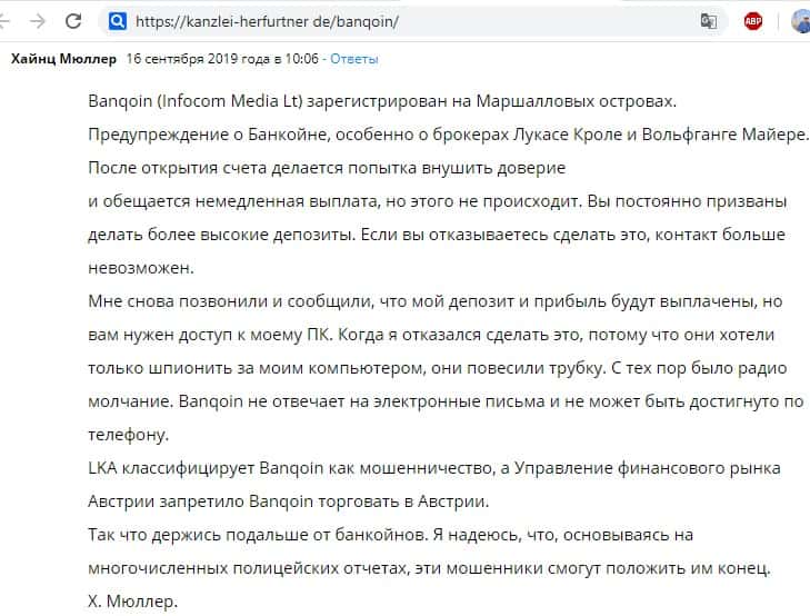 Обиженный клиент брокерской конторы Банкойн рассказывает на странице веб-портала kanzlei-herfurtner de о том, как он попытался сотрудничать с этим брокером, но был обманут его менеджерами и распрощался со своими денежными средствами.