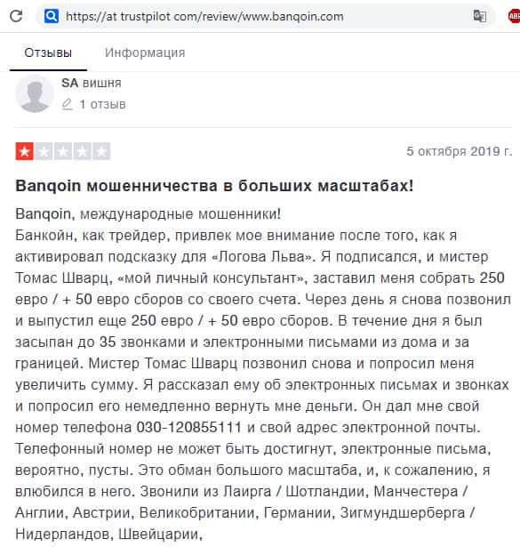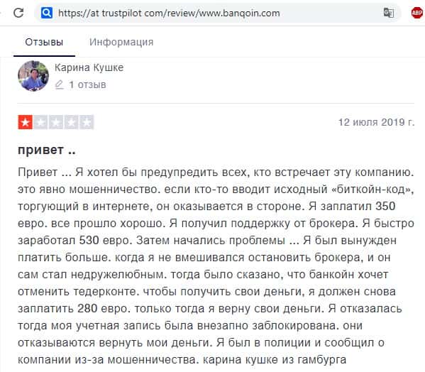 - Еще один негативный отзыв о лохотроне Банкойн, оставленный на веб-портале at trustpilot com