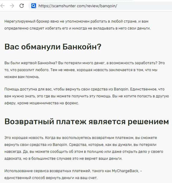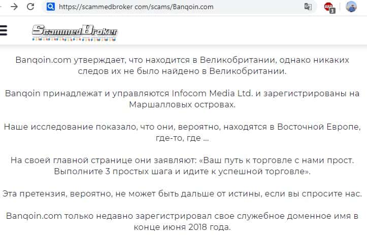 - Негативные комментарии в адрес компании Банкойн в обзоре на сайте scammedbroker com
