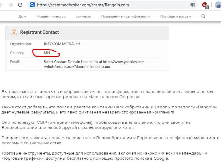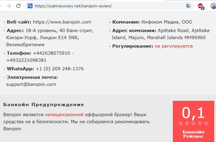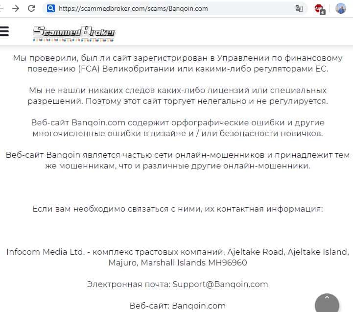 - Компания Banqoin зарегистрирована в оффшорной зоне на Маршалловых Островах