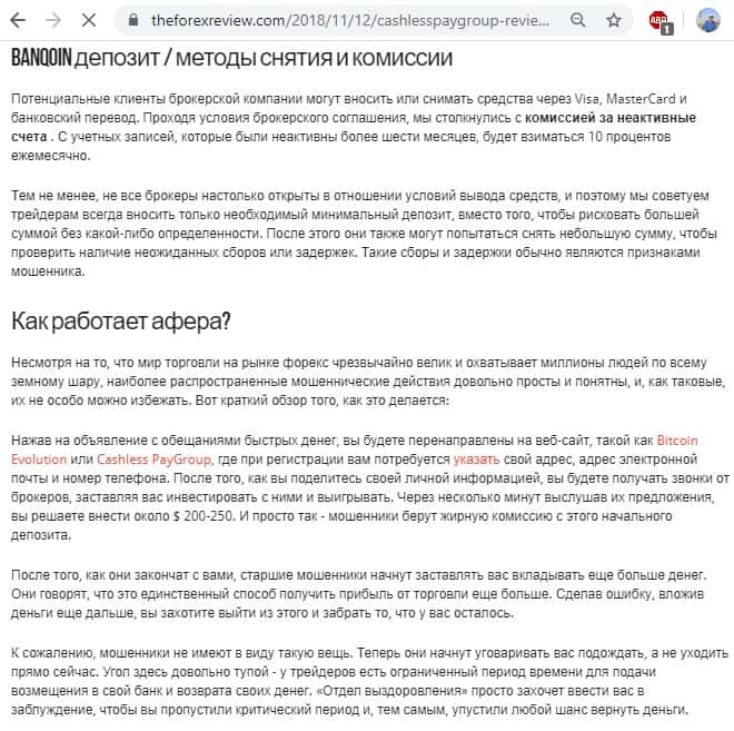 Негативные комментарии в адрес компании Банкойн в обзоре на сайте scammedbroker com