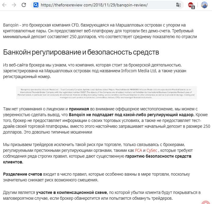 В аналитическом обзоре на веб-ресурсе scambroker com рассказывается, что брокерская компания Банкойн - это нелицензированная организация, которая зарегистрирована в оффшорной зоне на Маршалловых Островах и не регулируется надзорными финансовыми органами Великобритании и Европы.