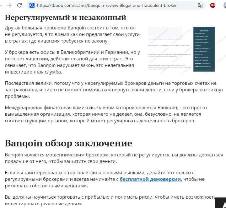 - Контактная информация брокера Banqoin, размещенная на его сайте
