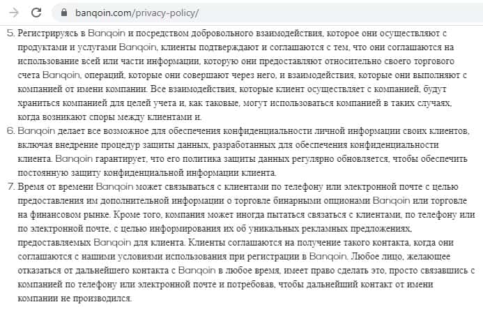 Как указывают менеджеры брокерской компании Банкойн в своем документе о политике конфиденциальности данных, клиенты должны подтвердить и согласиться на использование брокером их конфиденциальной информации о торговых операциях и в случаях разрешения споров. Поэтому доверяться этому брокеру в полной мере нельзя.