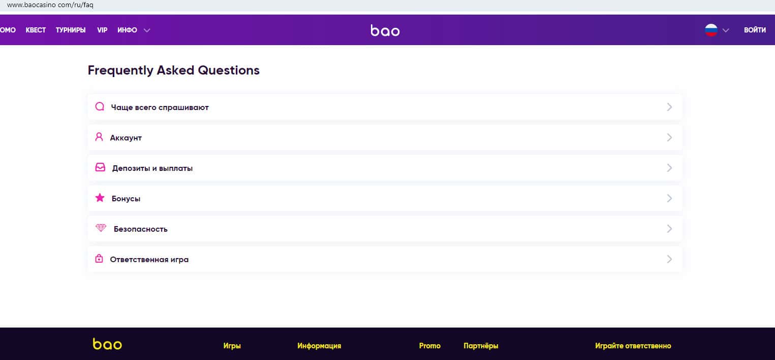Бао Казино - типичное незаконное казино, направленное на аудиторию с территории СНГ. Стоит напомнить, что все интернет казино ничем не контролируются и вообще является уголовным делом, поэтому играя в казино вы нарушаете закон и можете понести наказание. Не играйте с огнём, а именно с онлайн-казино Bao Casino.