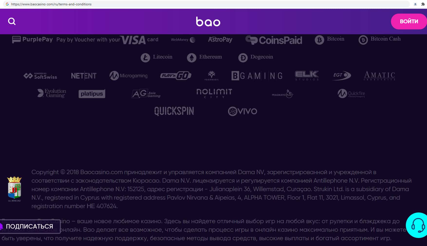 Казино Бао Казино, как и все мошеннические организации, зарегистрировано в офшорной зоне - на Кипре. Из-за своего местоположения руководство Бао Казино не может понести уголовной ответственности.