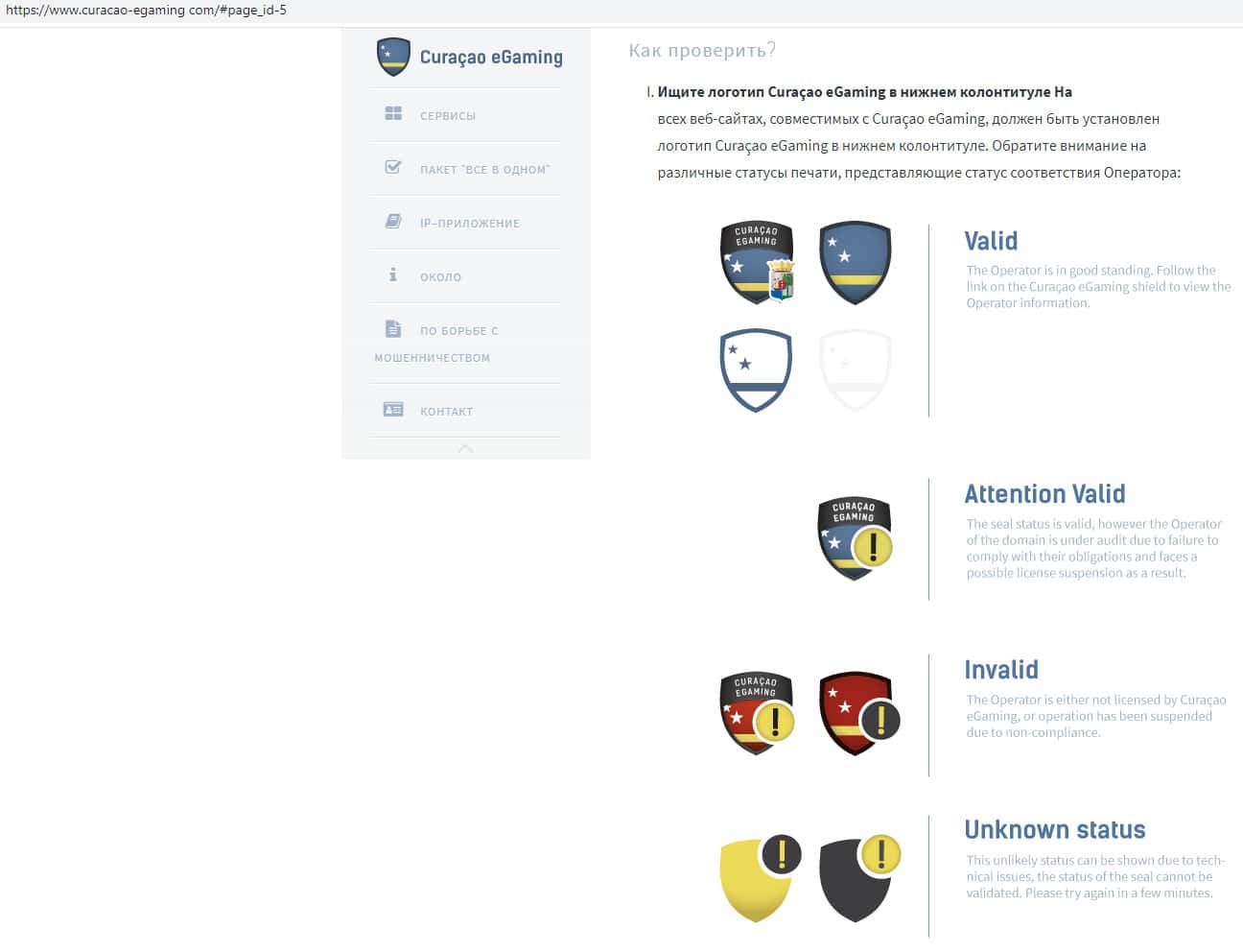 Теперь стоит проверить, существует ли такая лицензия. Первым условием, что сайт регулируется Кюрасао, является определённый знак в нижнем колонтитуле.
