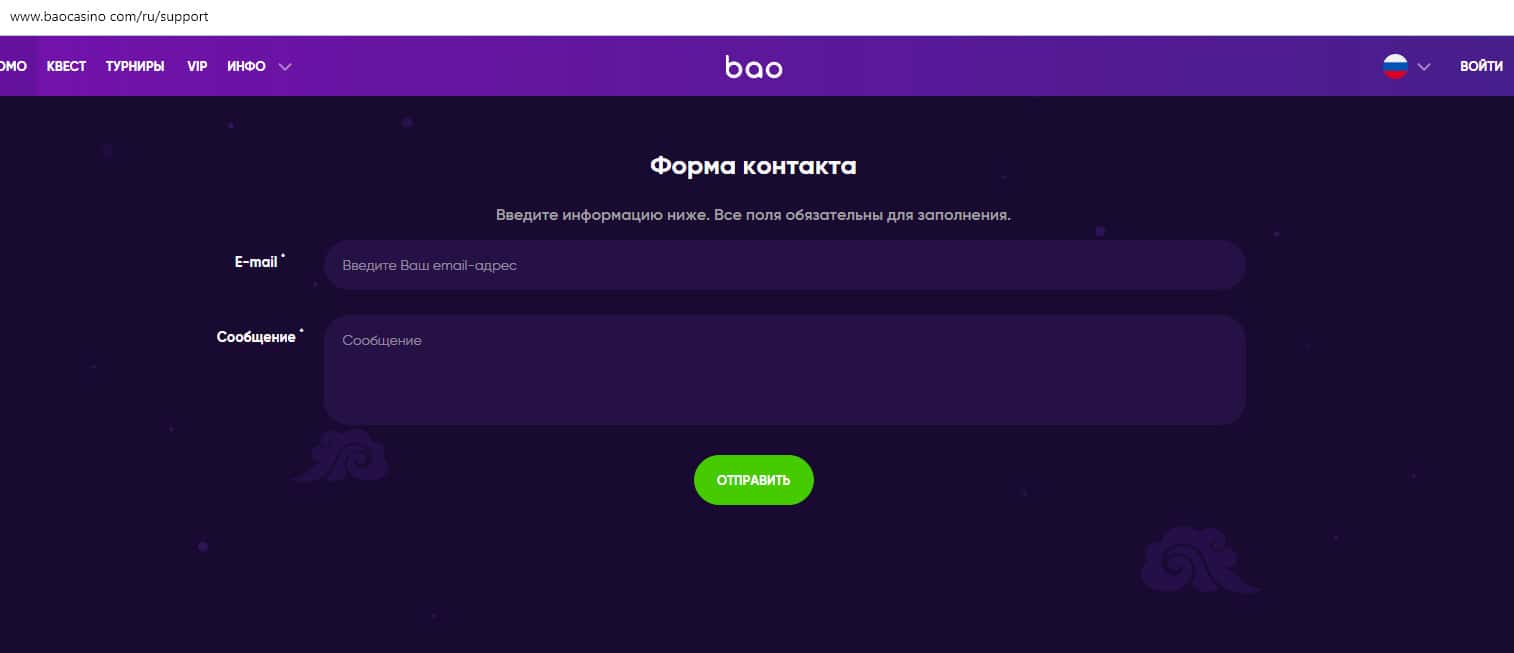 В том случае если обманщики из Бао Казино Вас слили, то в обязательном порядке напишите о данном факте нам. Оставьте адрес электронной почты в форме чуть ниже, и тогда с Вами выйдут на контакт.