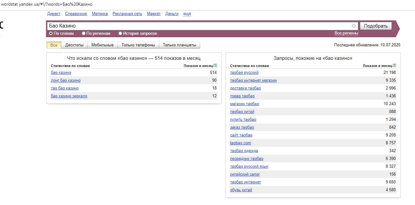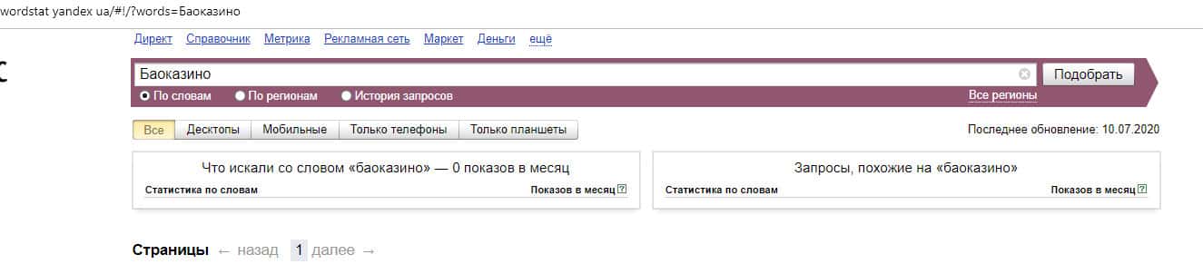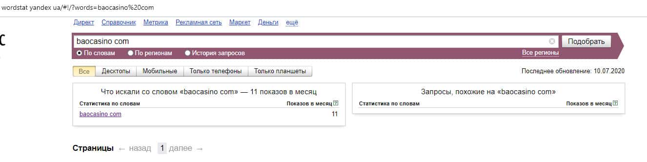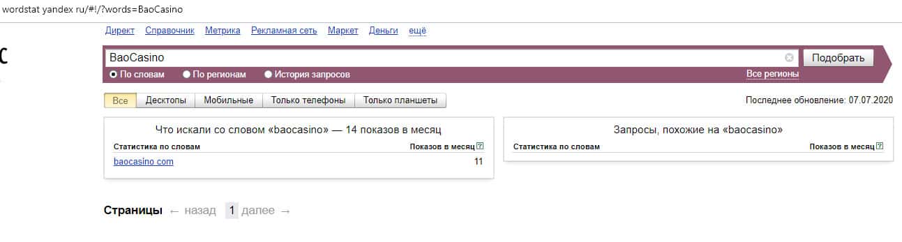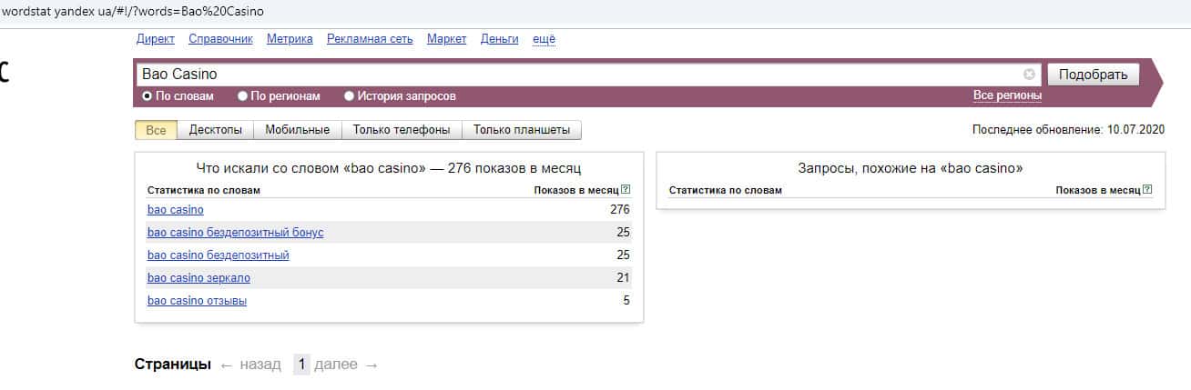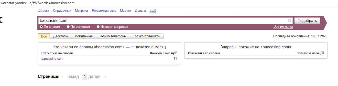 Вопреки словам Бао Казино о том, что оно популярное казино статистика на wordstat yandex com показывает, что за месяц Бао Казино набирает всего лишь 11 просмотров.
