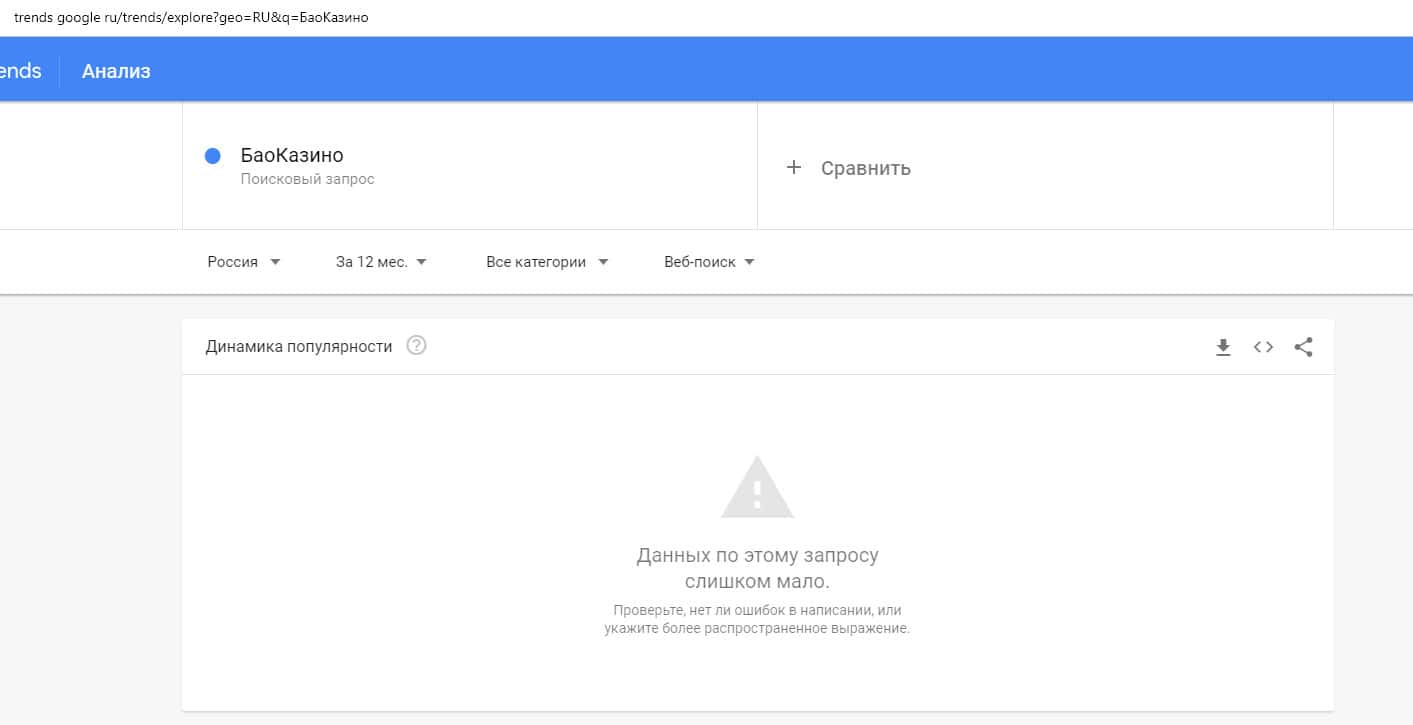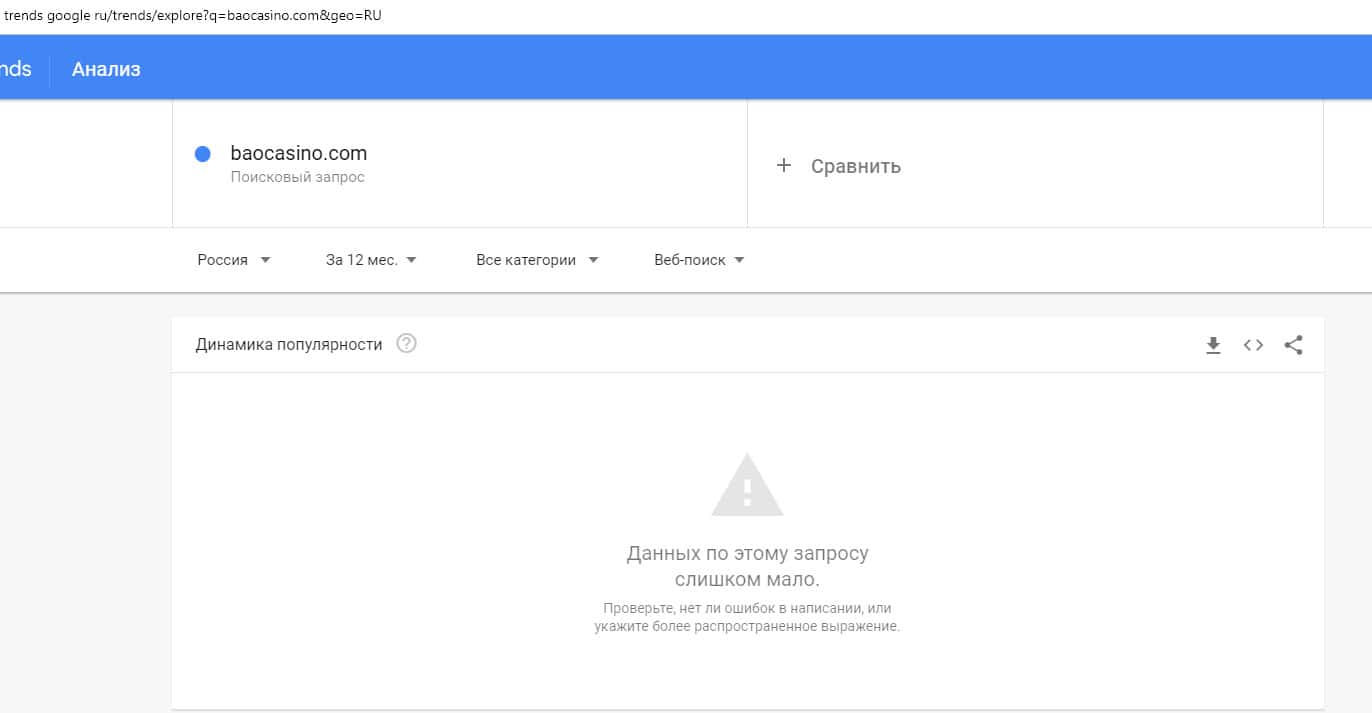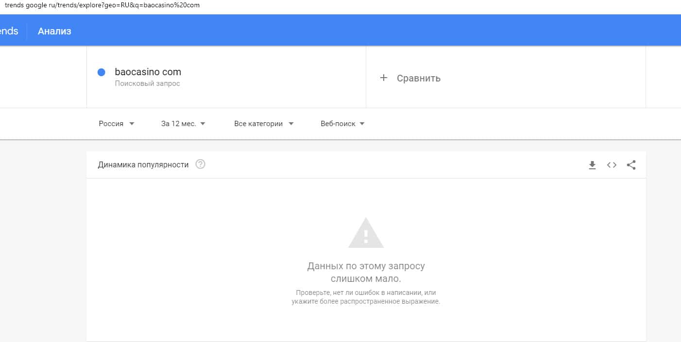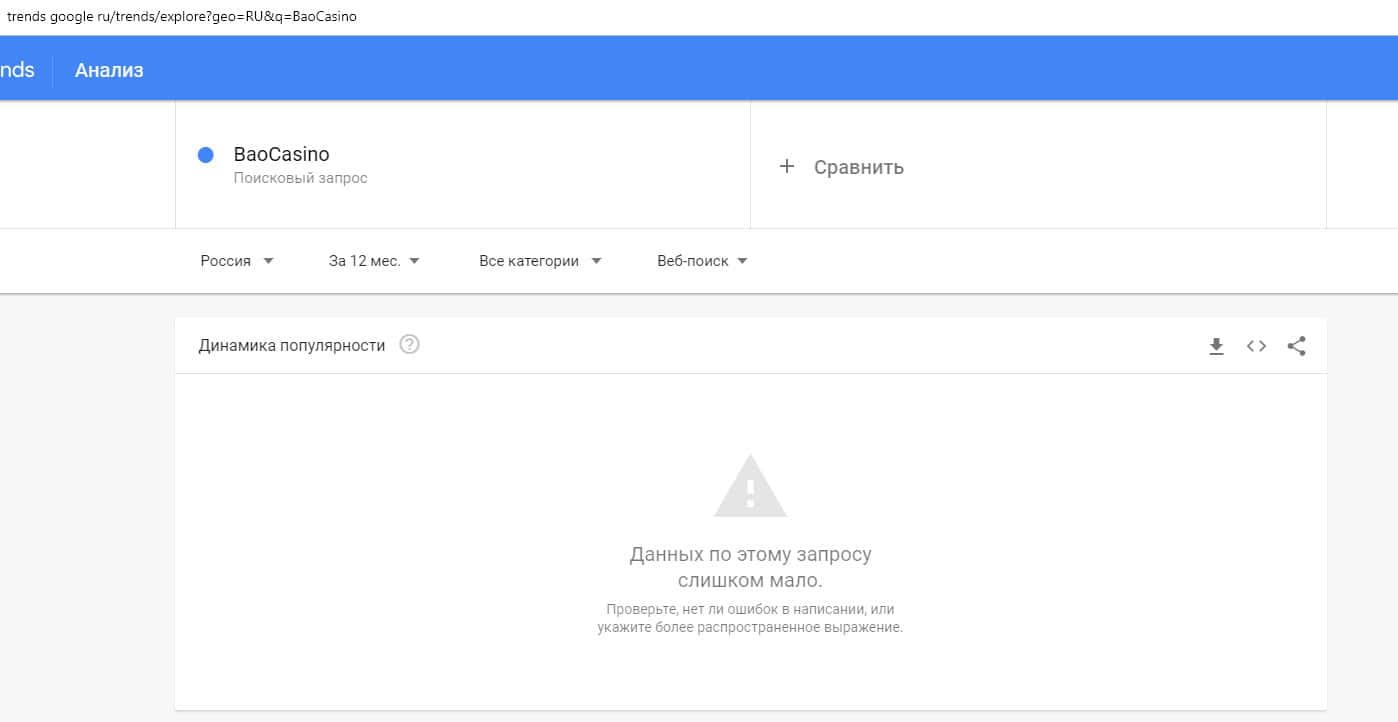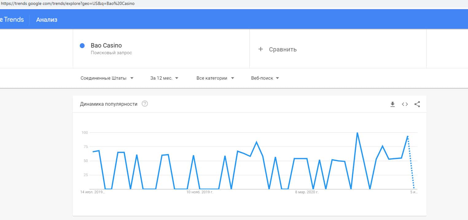 На сервисе Google Trends нам говорят, что запрос Bao Casino выполняют в среднем за месяц около двухсот раз, что тоже не соответствует "авторитету" казино.