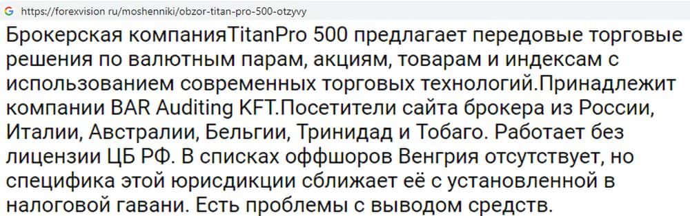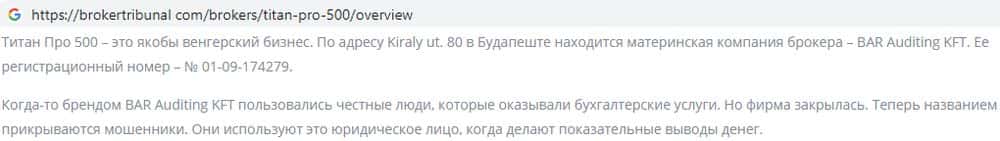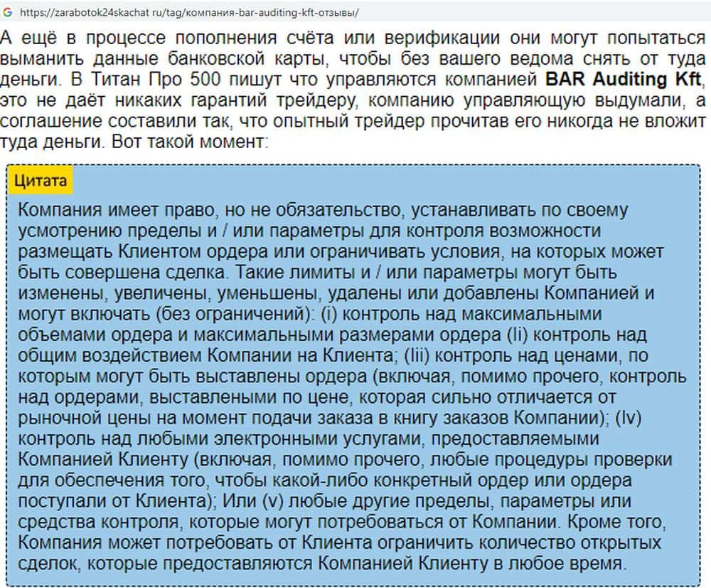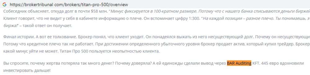 BarAuditing - липовая консалтинговая контора, которая якобы предоставляет консультации от опытных аналитиков рынка и трейдеров и управляет рядом лохотронов, в том числе Titan Pro 500. Хвастаются жулики и полным набором регулирующих документов, но на самом деле промышляют тем, что сливают депозиты клиентов себе в карман.