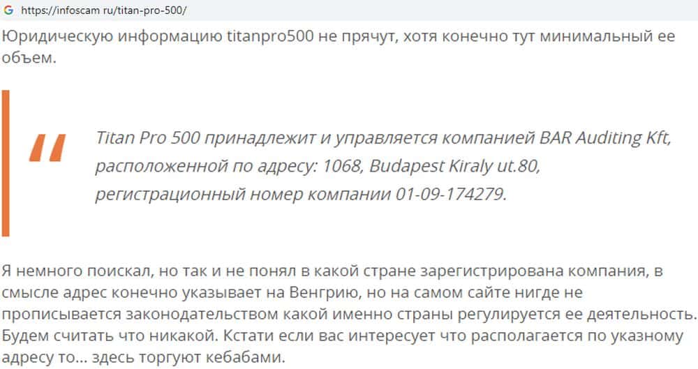 Согласно расследованию, которое провел ресурс infoscam ru, но адресу, который аферисты BarAuditing указали в качестве юридического, находится закусочная, предлагающая фастфуд. При все напускной причастности к Европе, мошенники явно нацелены именно на русскоязычную аудиторию, более того, могут находиться в Киеве.