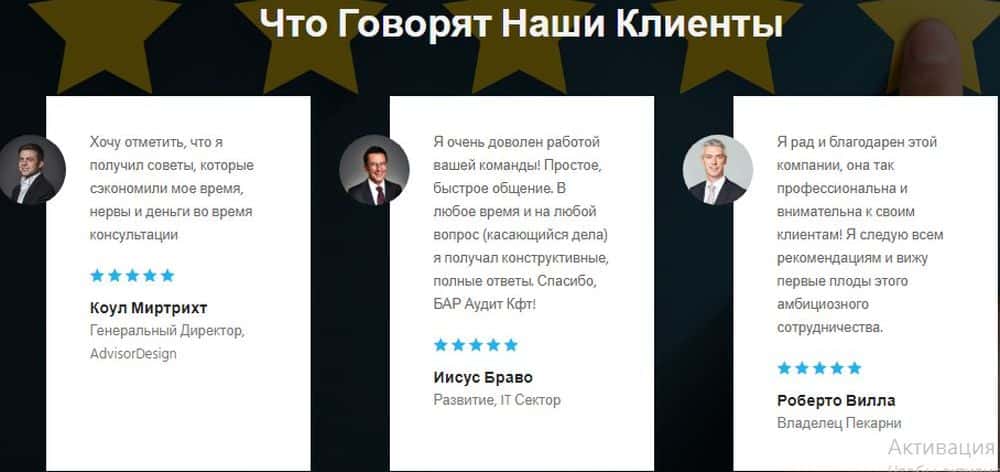 Сайт жуликов BarAuditing - вшивый одностраничник, который умудряется еле работать. Но пройдохи нашли место, чтобы вставить фейковые отзывы. Персонажи фиктивные, сами тексты так красиво написаны, будто на заказ. Веселит подбор персонажей - генеральный директор и владелец пекарни, которых осчастливило сотрудничество с ворюгами Бар Аудитинг.