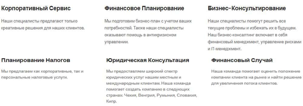 Далее на подвальном сайте у мошенников BarAuditing следует их довольно сомнительный перечень услуг, на основании которых аферисты Бар Аудитинг будут пытаться развести наивных пользователей сети интернет и слить их непосредственно в руки брокера-мошенника. На изображении, расположенном ниже, вы можете наглядно увидеть данный раздел сайта.