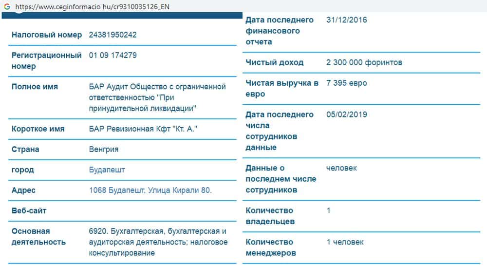 Консалтинговые мошенники BarAuditing используют на своем сайте имя компании Bar Auditing Kft, правда, нигде непосредственно о лицензии или регуляции не говорят. При необходимости каждый желающий может проверить, что да, такая контора есть в Венгрии. Вернее, была до 2016 года и занималась бухучетом и аудитом, а потом распалась.